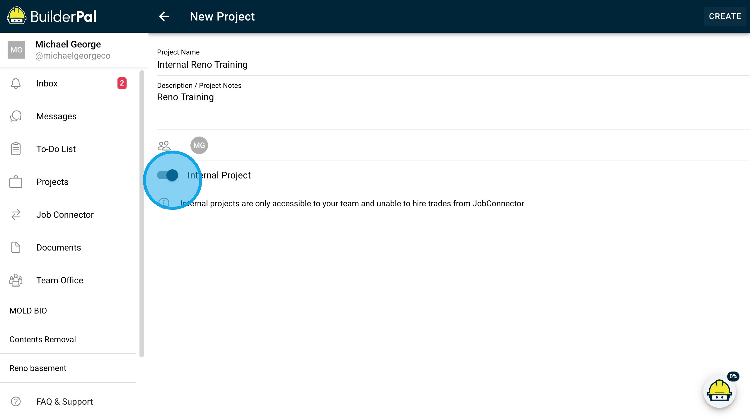 Internal projects in BuilderPal are private, team-only workspaces for non-client tasks like training or internal operations, while regular projects are designed for client-facing construction jobs with features for subcontractor collaboration and bidding.