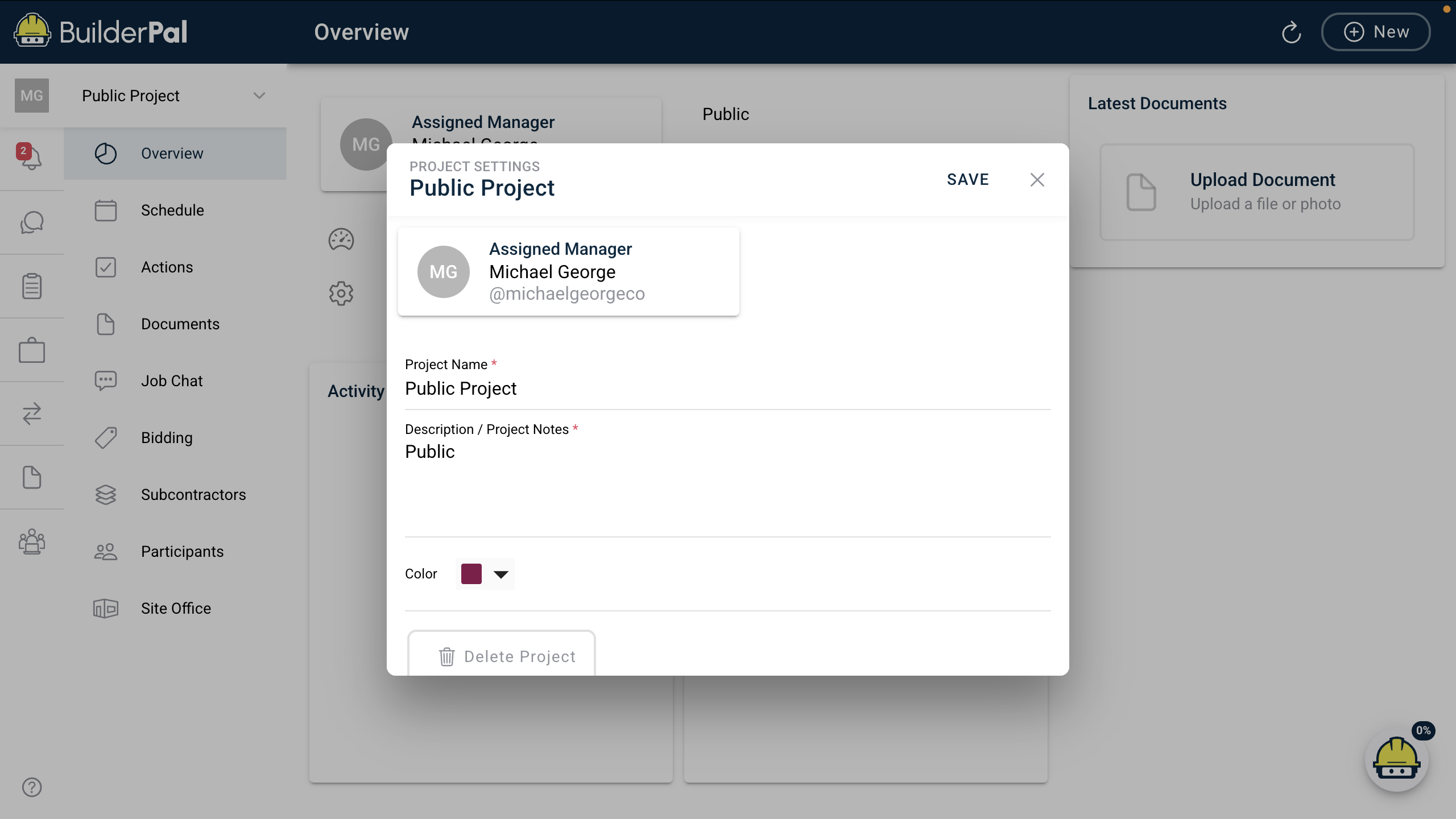 This reference covers the fields and options available in the Project Settings modal of BuilderPal, allowing users to edit core project information like name, manager, description, and color.