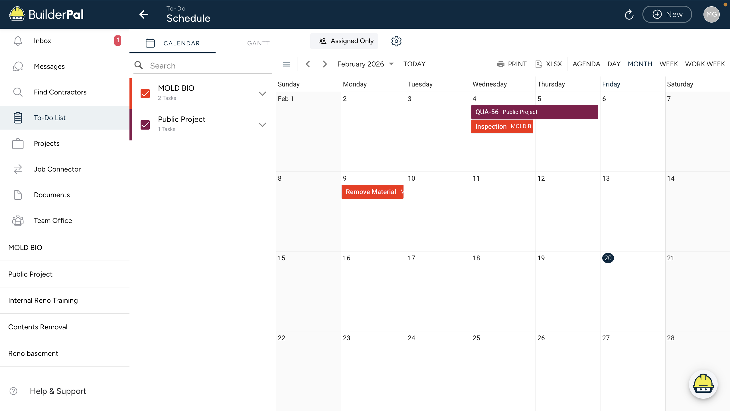 The Master Schedule (also called the Global Calendar) in BuilderPal displays every task, deadline, and scheduled item across all projects you have access to in one company-wide calendar view. It gives managers and admins a complete overview of workload, timelines, and progress without opening individual projects.